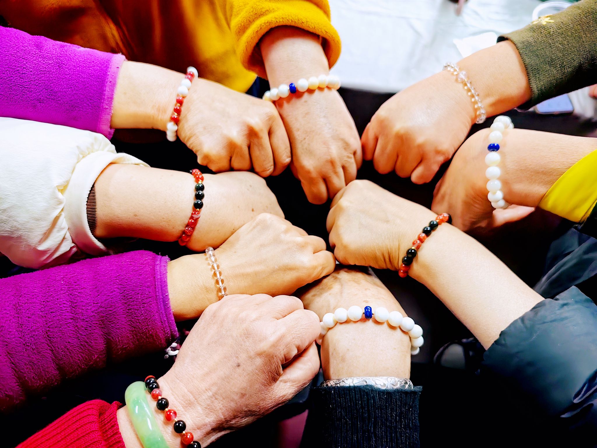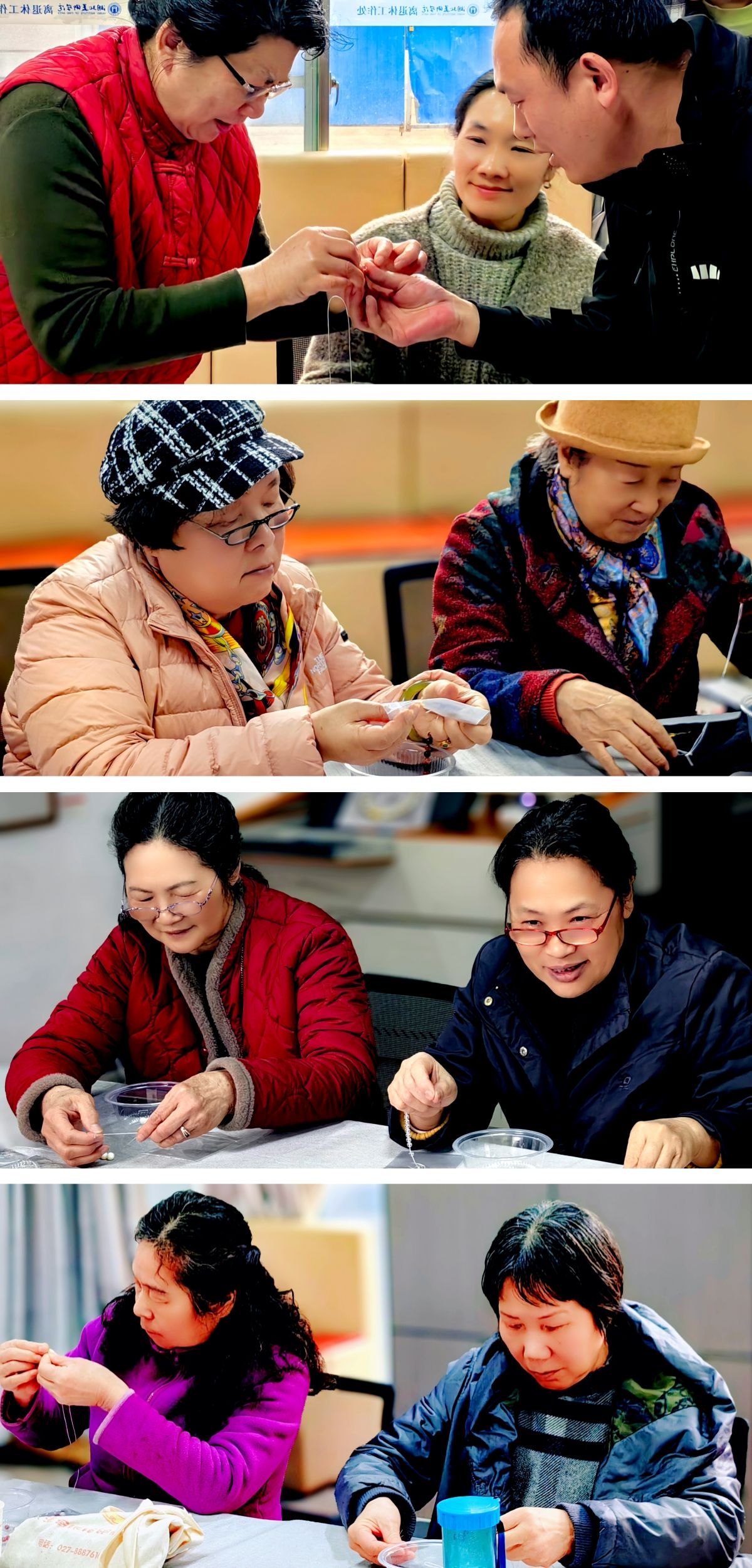 “这些珠子颜色真漂亮,搭配起来很有讲究!”“没想到串珠还能锻炼手指灵活性,对咱们老年人来说太适合了!”活动中,大家互相分享经验,互相帮助,遇到难题时共同探讨,欢声笑语不断。经过一个多小时的精心制作,一串串造型别致、色彩斑斓的珠串作品陆续完成,有精致的手链、可爱的挂件,每一件作品都凝聚着老师们的巧思与创意。