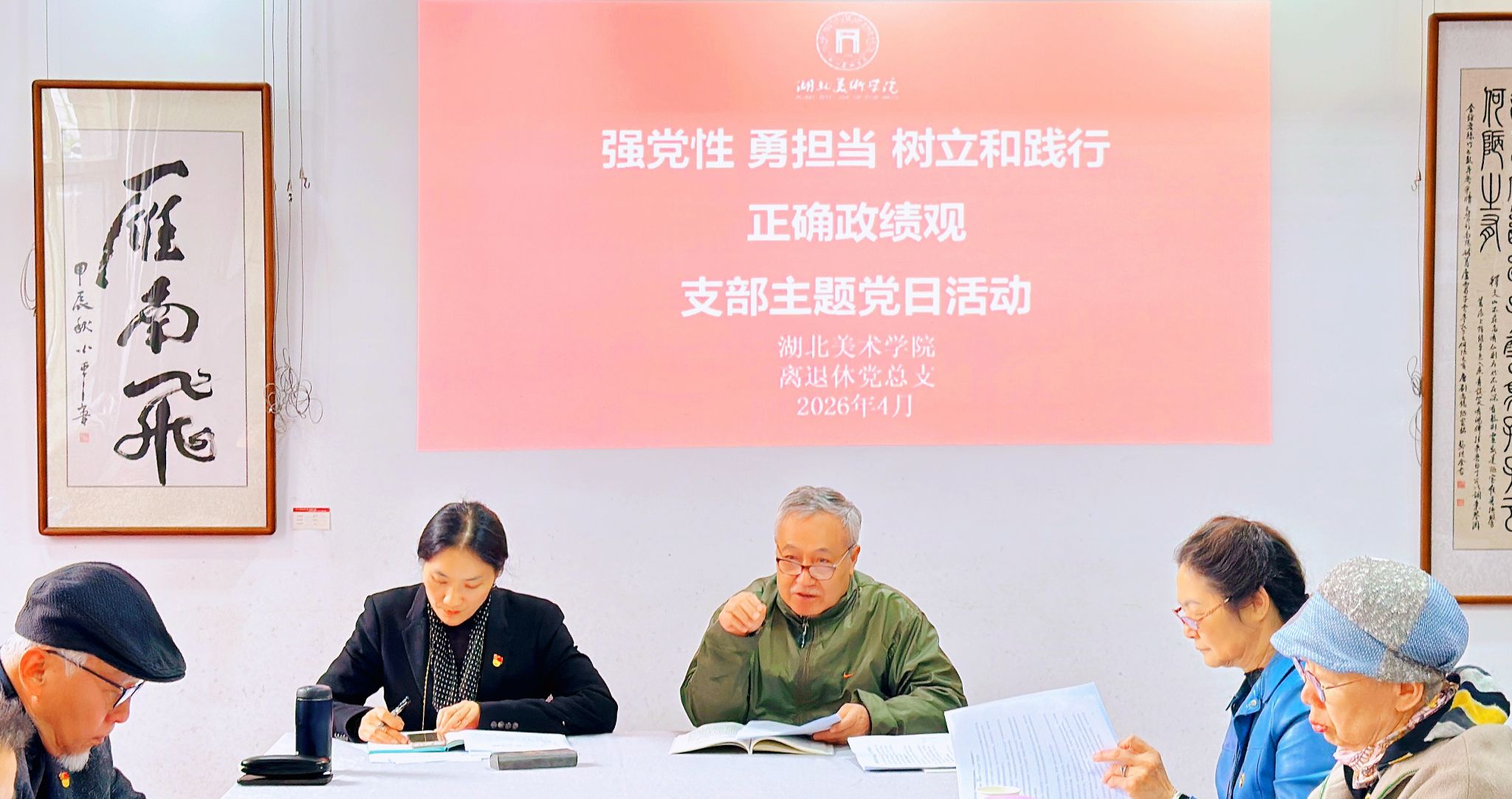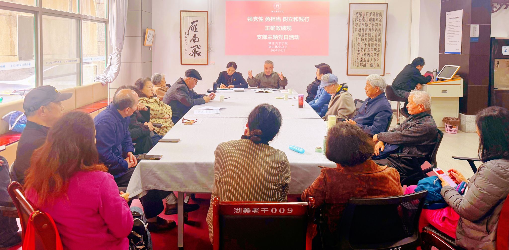 为深入贯彻落实党中央关于在全党开展树立和践行正确政绩观学习教育的部署要求,引导离退休党员深刻理解“政绩为谁而树、树什么样的政绩、靠什么树政绩”的核心要义,4月23日,湖北美术学院离退休行政党支部与离退休教师党支部联合开展“强党性 勇担当 树立和践行正确政绩观”主题党日活动。离退休党总支书记陈美玲,党支部书记项金国,行政党支部书记邵岚,以及来自两个支部的离退休党员代表参加活动。